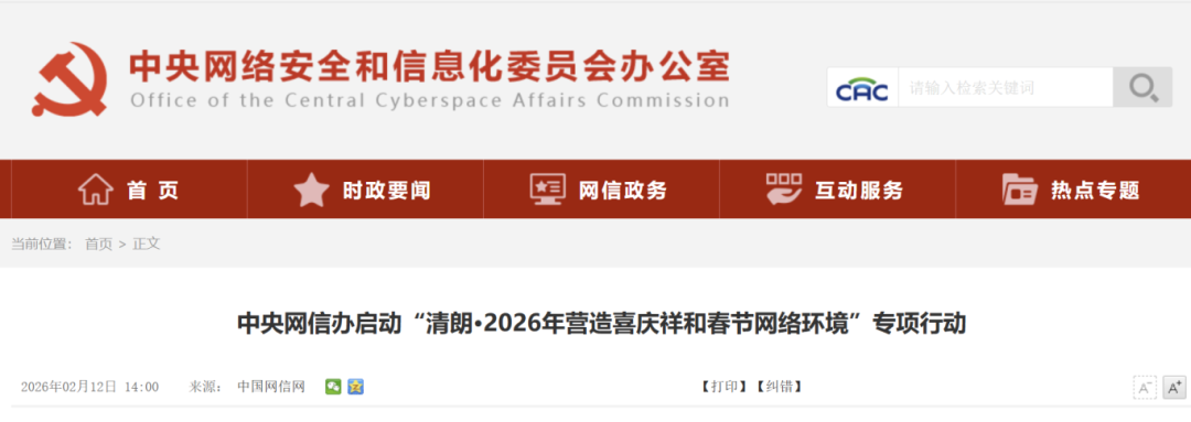 為了營(yíng)造喜慶祥和、積極向上的春節(jié)網(wǎng)絡(luò)氛圍,中央網(wǎng)信辦決定開展為期1個(gè)月的“清朗·2026年?duì)I造喜慶祥和春節(jié)網(wǎng)絡(luò)環(huán)境”專項(xiàng)行動(dòng)。
